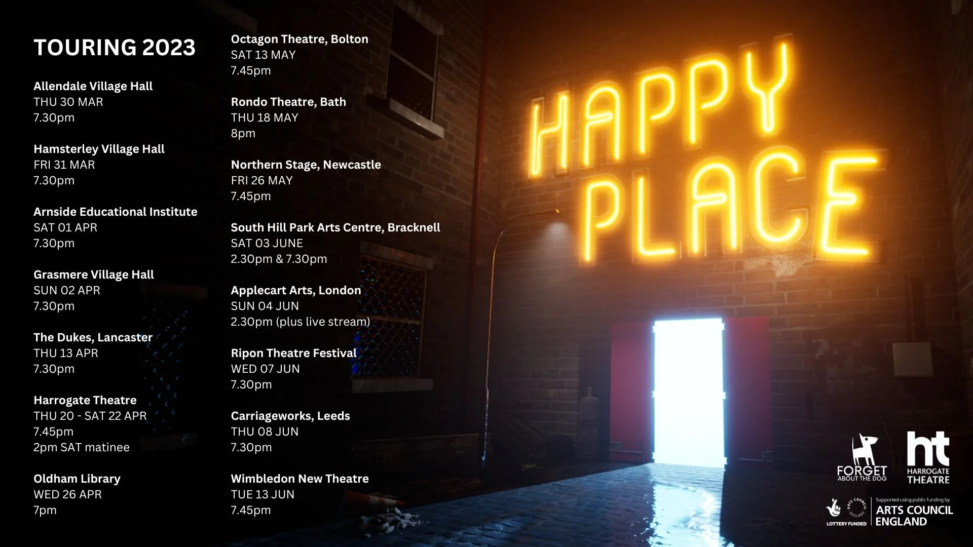 Happy Place was our third production and was a creation born out of many Zoom sessions during the Covid lockdowns. It was performed at Underbelly, Cowgate, Edinburgh Fringe 2022, before embarking on a national UK tour in the Spring/Summer of 2023. The tour was supported by Harrogate Theatre and funded by Arts Council England.